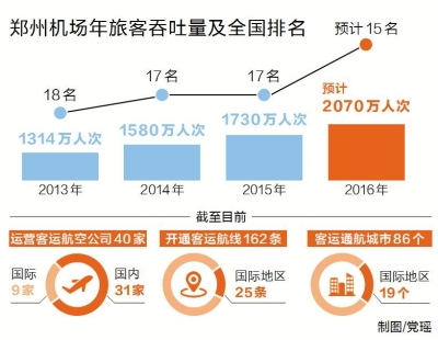 據(jù)鄭州機場相關(guān)負責人介紹,2014年鄭州機場旅客吞吐量突破1580萬人次,同比增長20%,增速位居全國20個大型機場首位。