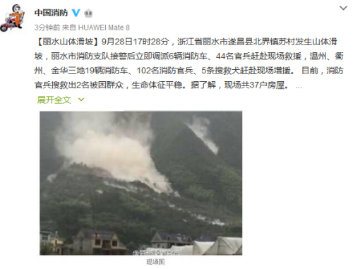 據(jù)浙江省麗水市公安消防支隊官方微博消息,2016年9月28日17點28分許,遂昌縣北界鎮(zhèn)蘇村上村自然村發(fā)生山體滑坡。